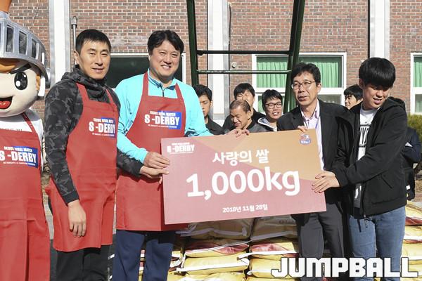 [점프볼=양지/홍기웅 기자] 28일 양지바른 장애인 거주시설에서 '2018-2019 SKT 5GX 프로농구' S더비 사랑의 쌀 전달식이 진행됐다. 이번 사랑의 쌀 전달식은 SK와 삼성의 이번시즌 양팀간에 2번의 맞대결을 통해 2승을 한 문경은 감독이 142만원, 2패를 한 이상민 감독이 124만원을 적립해 총 266만원을 적립해서 구매한 1000kg의 쌀로 장애인 복지시설에 전달식을 진행했다. 삼성 이상민 감독과 SK 문경은 감독이 양지바른 장애진 거주시설에 사랑의 쌀 전달식 기부를 진행하고 있다.