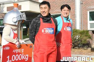 [점프볼=양지/홍기웅 기자] 28일 양지바른 장애인 거주시설에서 '2018-2019 SKT 5GX 프로농구' S더비 사랑의 쌀 전달식이 진행됐다. 이번 사랑의 쌀 전달식은 SK와 삼성의 이번시즌 양팀간에 2번의 맞대결을 통해 2승을 한 문경은 감독이 142만원, 2패를 한 이상민 감독이 124만원을 적립해 총 266만원을 적립해서 구매한 1000kg의 쌀로 장애인 복지시설에 전달식을 진행했다. 삼성 이상민 감독과 SK 문경은 감독이 양지바른 장애진 거주시설에 사랑의 쌀 전달식 기부를 마치고 장애우 분들과 단체 촬영을 하고 있다.