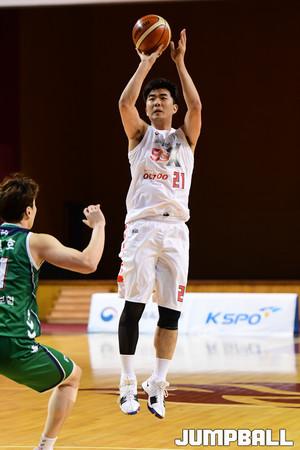 [점프볼=수원/박상혁 기자] 4일 경희대체육관에서 2018 KBL D리그 원주DB와 서울SK의 경기가 열렸다. SK 김동욱이 스텝백으로 득점을 노리고 있다.