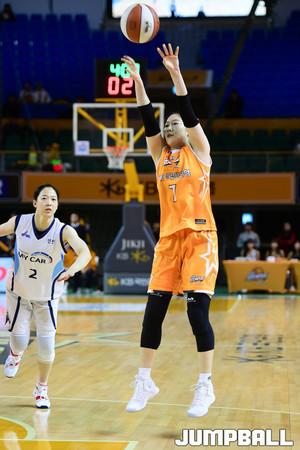 [점프볼=청주/박상혁 기자] 5일 청주실내체육관에서 우리은행 2018-2019 여자프로농구 정규리그 청주KB국민은행과 인천신한은행의 경기가 열렸다. KB 염윤아가 시간에 쫓겨 슛을 던지고 있다.