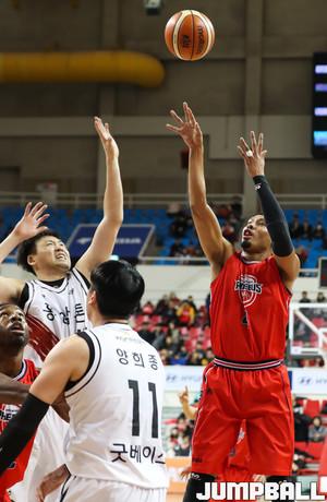 9일 울산 동천체육관에서 열린 '2018-2019 SKT 5GX 프로농구' 울산 현대모비스와 안양 KGC의 경기에서 KGC 테리가 현대모비스 라건아의 수비를 피해 슛을 하고 있다.