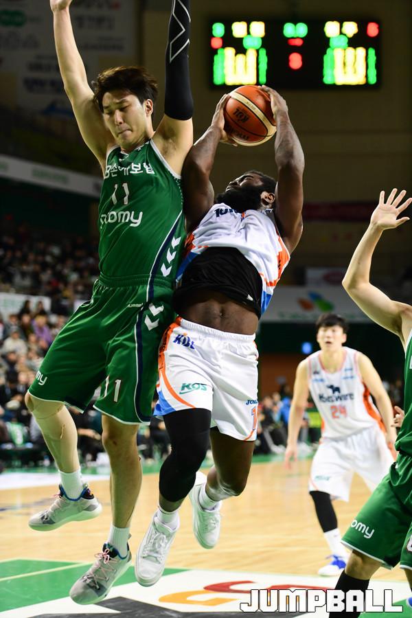 [점프볼=원주/박상혁 기자] 20일 원주종합체육관에서 2018-2019 SKT 5GX 프로농구 원주 DB와 인천 전자랜드의 경기가 열렸다. 전자랜드 팟츠가 DB 유성호의 수비를 피해 슛을 시도하려 하고있다.
