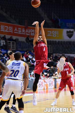 [점프볼=고양/박상혁 기자] 21일 고양체육관에서 2018-2019 SKT 5GX 프로농구 고양 오리온과 서울 삼성의 경기가 열렸다. 삼성 천기범이 수비수를 앞에두고 슛을 올리고 있다.