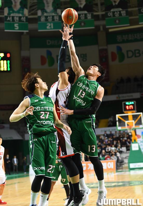 [점프볼=원주/문복주 기자] 22일 원주종합체육관에서 열린 '2018-2019 SKT 5GX 프로농구' 원주 DB와 부산 KT의 경기. DB 윤호영이 골밑에서 리바운드를 다투고 있다.