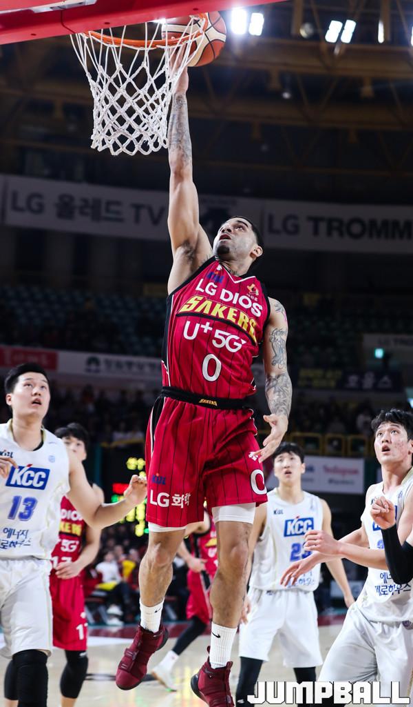 22일 창원실내체육관에서 열린 '2018-2019 SKT 5GX 프로농구' 창원 LG와 전주 KCC의 경기에서 LG 그레이가 레이업 슛을 하고 있다.
