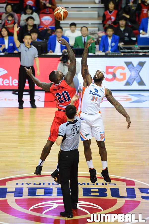 [점프볼=울산/박상혁 기자] 22일 울산동천체육관에서 2018-2019 SKT 5GX 프로농구 정규리그 울산 현대모비스와 인천 전자랜드의 경기가 열렸다. 현대모비스 라건아와 전자랜드 할로웨이가 하프라인에서 점프볼을 시도하였다.