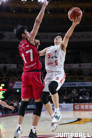 23일 창원실내체육관에서 열린 '2018-2019 SKT 5GX 프로농구' 창원 LG와 서울 SK의 경기에서 SK 송창무가 LG 조성민의 수비를 피해 슛을 하고 있다.