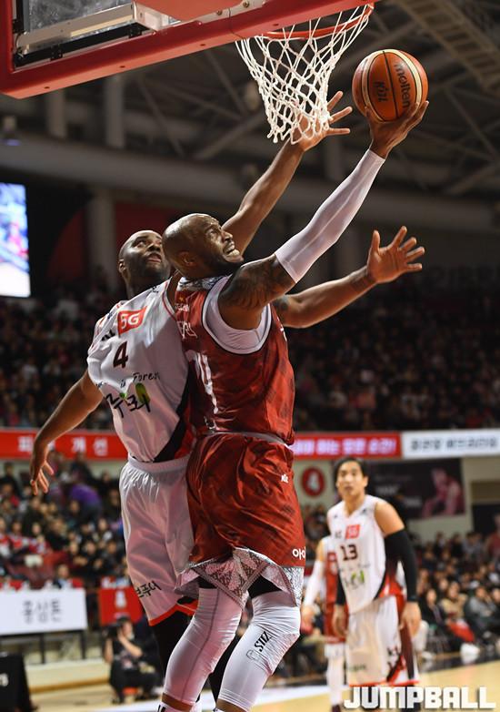 [점프볼=안양/문복주 기자] 25일 안양실내체육관에서 열린 '2018-2019 SKT 5GX 프로농구' 안양 KGC인삼공사와 부산 KT의 경기, KGC인삼공사 테리가 골밑 사이드로 파고들어 슛을 시도하고 있다.