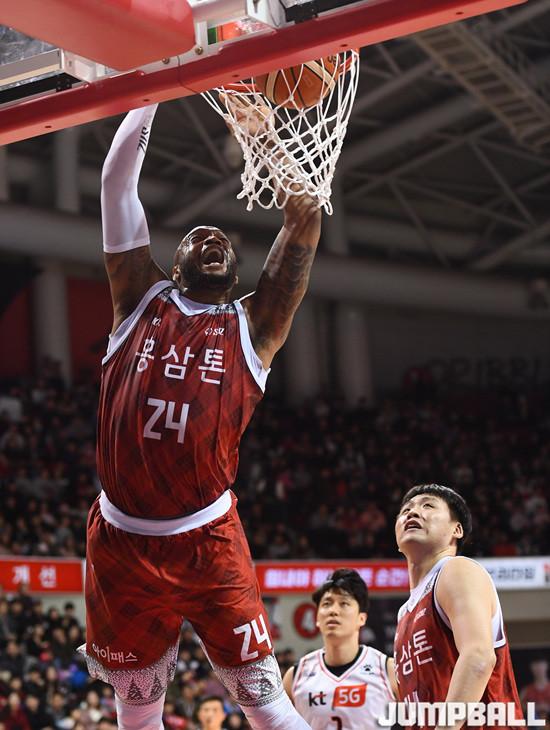 [점프볼=안양/문복주 기자] 25일 안양실내체육관에서 열린 '2018-2019 SKT 5GX 프로농구' 안양 KGC인삼공사와 부산 KT의 경기, KGC인삼공사 테리가 파워풀한 공격력을 펼치며 덩크를 작렬하고 있다.