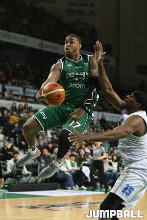25일 원주종합체육관에서 열린 '2018-2019 SKT 5GX 프로농구' 원주 DB 와 전주 KCC 의 경기에서 김태홍이 연장전 중요한 득점을 성공 시키고 있다.