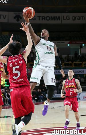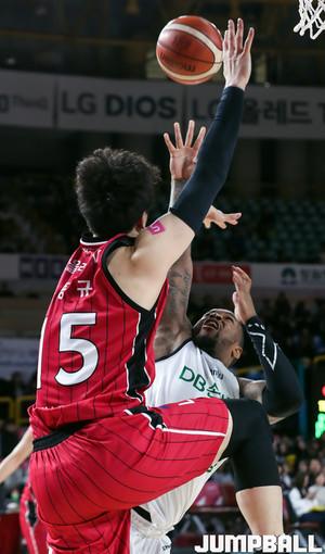 29일 창원실내체육관에서 열린 '2018-2019 SKT 5GX 프로농구' 창원 LG와 원주 DB의 경기에서 LG 김종규가 DB 포스터의 수비를 피해 슛을 하고 있다.