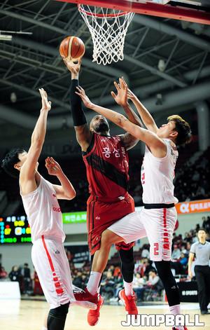 30일 안양 신내체육관에서 열린 '2018-2019 SKT 5GX 프로농구' 안양 KGC인삼공사와 서울 SK 경기에서 KGC인삼공사 저스틴 에드워즈가 골밑슛을 시도하고 있다.