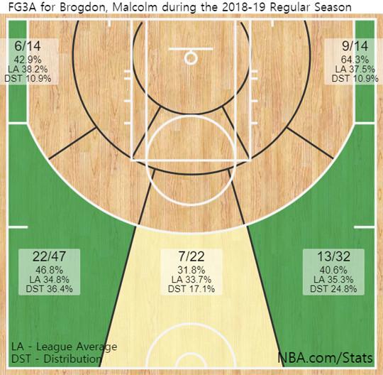 특히, 올 시즌 브록던은 위에 3점 슛 성공률 분포도에 나타나듯 정교한 슈팅능력으로, 리그 정상급 슈터로 입지를 굳혀나가고 있다. 실제, 브록던은 야투성공률(FG) 50.4%-3점 성공률(3P) 44.2%-자유투 성공률(FT)도 98.2%를 기록, 이른바 슈터들의 상징이라 일컬어지는 ‘180 클럽’ 가입에 도전 중이다. 브록던은 미들턴과 함께 밀워키 드라이브 앤 킥 전술에서 슈터의 역할을 맡고 있다. 부덴홀저 감독은 다른 선수들에겐 인사이드에서 확률 높은 득점 시도를 가져가도록 요구했지만 반대로 브록던에겐 이들과 동선이 겹치는 걸 최소화하기 위해 미드레인지 게임을 많이 시도하도록 주문하고 있다.