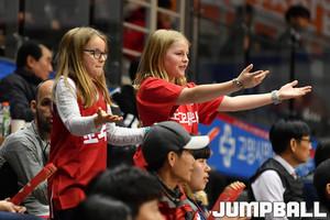[점프볼=고양/홍기웅 기자] 4일 고양실내체육관에서 열린 '2018-2019 SKT 5GX 프로농구' 고양 오리온과 안양 KGC의 경기. 오리온 치어리더가 아디다스 슈팅 이벤트 참가자들을 위해 응원을 하고 있다.