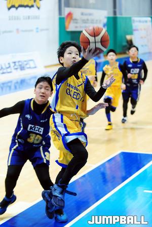 [점프볼=용인STC/이청하 기자] 6일 삼성휴먼센터에서 열린 2018-2019 KBL 유소년 주말리그 A권역 초등부 고학년 삼성과 KCC의 경기에서 삼성썬더스 유소년 선수가 수비수를 달고 레이업슛을 시도하고 있다.