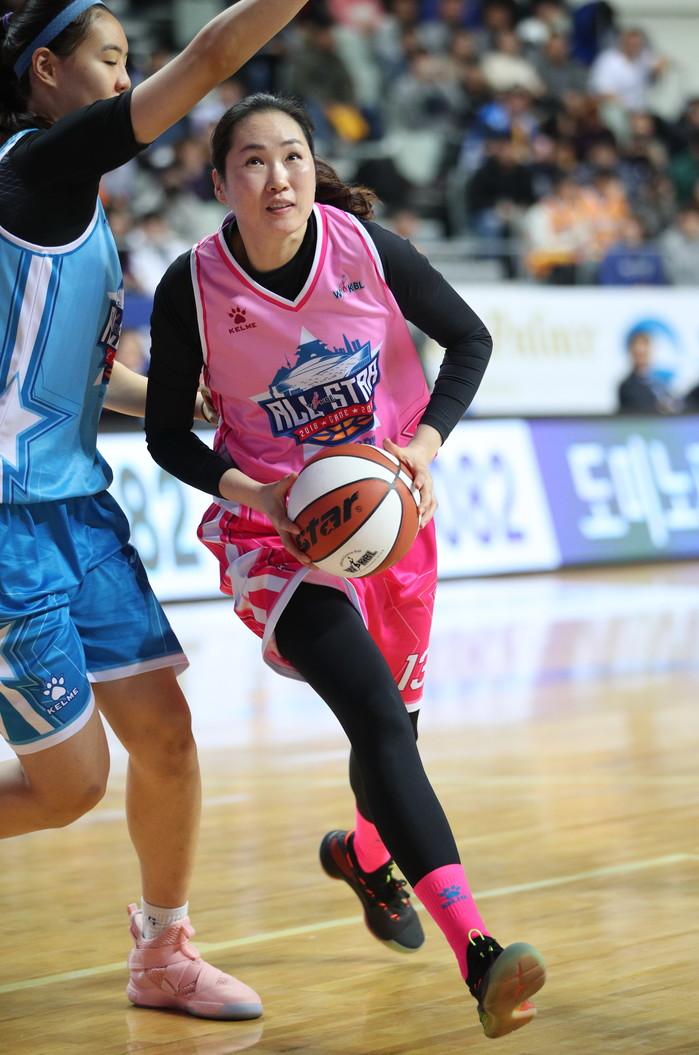 6일 서울 장충체육관에서 열린 우리은행 2018-2019 WKBL 올스타전경기, 3쿼터 경기에 나선 핑크스타 이종애가 골밑 공격을 위해 돌파를 시도하고 있다.
