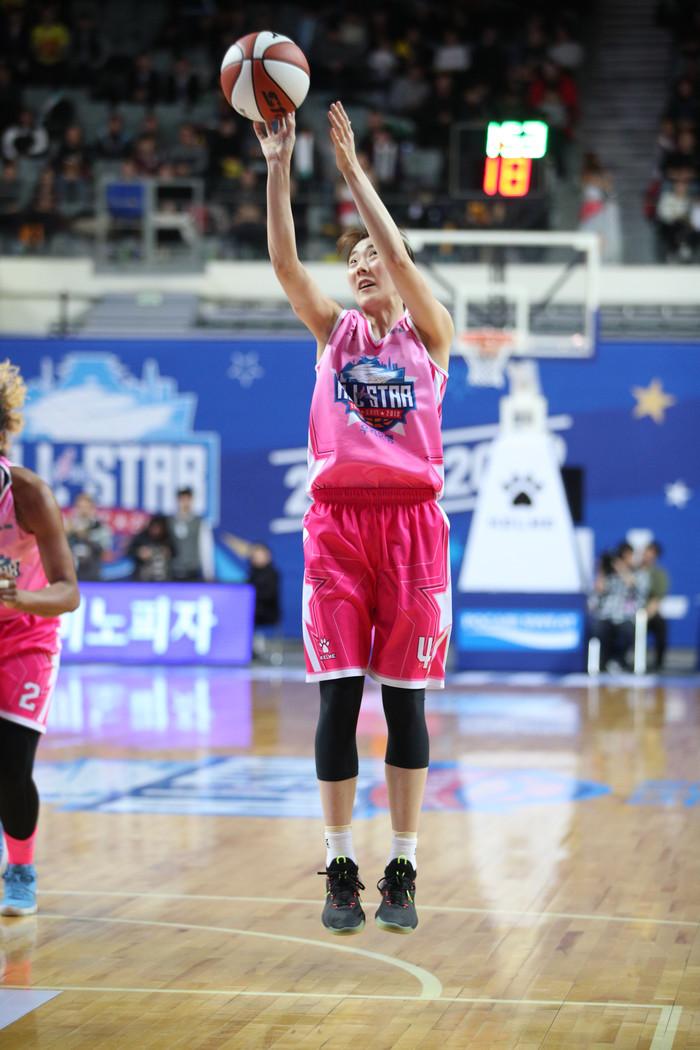 6일 서울 장충체육관에서 열린 우리은행 2018-2019 WKBL 올스타전경기, 리드를 빼앗긴 핑크 스타의 박혜진이 3점슛으로 반격에 나서고 있다.