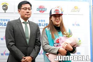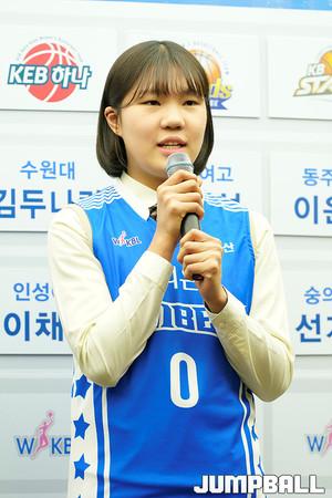 [점프볼=중구/유용우 기자] 08일 중구 소공로에 위치한 우리은행 본점 5층 회의실에서 열린 2018~2019 WKBL 신입선수 선발회, 동주여고 이윤미가 1라운드 6순위로 KB스타즈에 지명되었다. 동주여고 이윤미가 소감을 밝히며 눈물을 흘리고 있다.