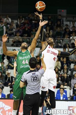 [점프볼=원주/유용우 기자] 9일 원주 종합체육관에서 열린 '2018-2019 SKT 5GX 프로농구' 원주 DB와 고양 오리온의 경기, 오리온 최진수가 수비를 두고 슛을 던지고 있다.