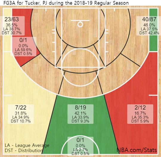마찬가지 터커는 공격 작업에서도 캐치 앤 슈터로까지 완벽히 변신, 휴스턴 이적 후 리그를 대표하는 블루워커이자 3&D 플레이어로 거듭났다. 휴스턴 이적 후 지난 2시즌 동안 평균 38.2%(1.6개 성공)의 3점 성공률을 기록 중인 터커는 올 시즌 평균 39%(1.9개 성공)의 3점 성공률을 기록 중이다. 특히, 터커는 아래 3점 성공률 분포도에 나타나듯, 양쪽 윙 사이드에서 높은 외곽 적중률을 보이고 있다.