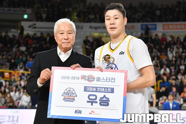 [점프볼=창원/홍기웅 기자] 20일 창원실내체육관에서 열린 '2018-2019 SKT 5GX 프로농구 올스타전' 3점슛 컨테스트 본선. LG 조성민이 3점슛 컨테스트 우승을 확정짓고 대한농구협회 방열 회장과 기념 촬영을 하고 있다.