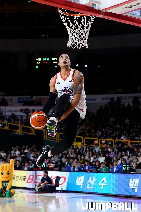 [점프볼=창원/유용우 기자] 20일 창원실내체육관에서 열린 2018-2019 SKT 5GX 프로농구 올스타전, 덩크 콘테스트 결선에서 에드워즈가 덩크를 시도하고 있다.