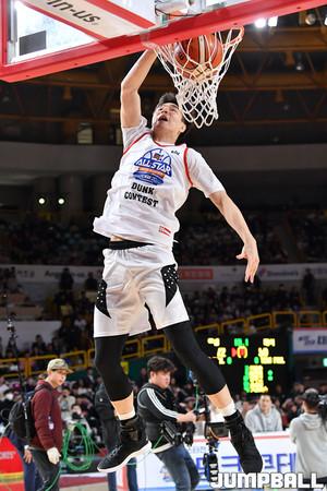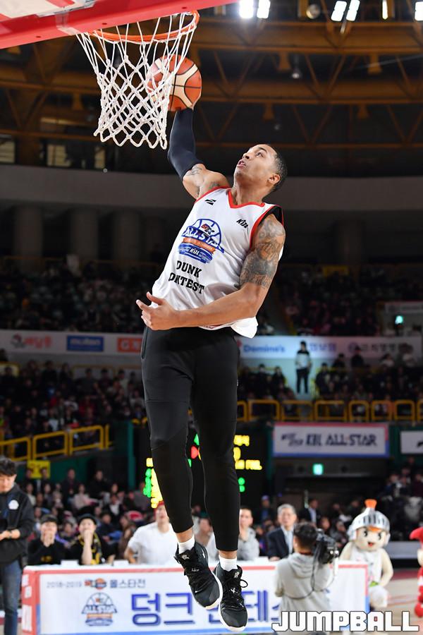 [점프볼=창원/홍기웅 기자] 20일 창원실내체육관에서 열린 '2018-2019 SKT 5GX 프로농구 올스타전' 덩크 콘테스트 결선. KGC 저스틴 에드워즈가 덩크를 시도하고 있다.