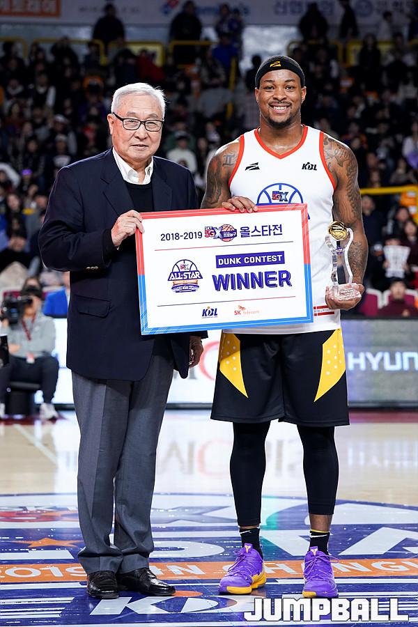 [점프볼=창원/유용우 기자] 20일 창원실내체육관에서 열린 2018-2019 SKT 5GX 프로농구 올스타전, DB 마커스 포스터가 외국선수 덩크 콘테스트에서 우승하였다.