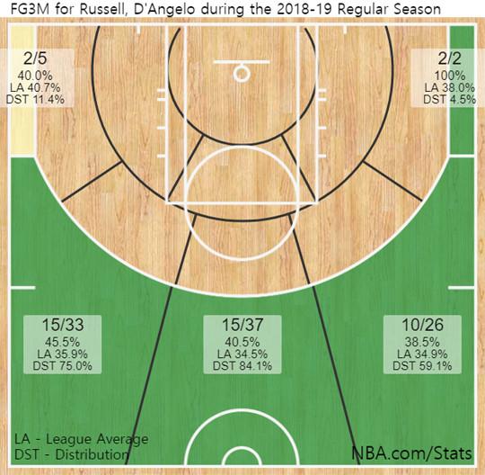 #디안젤로 러셀 최근 정규리그 12경기 3점 성공률 분포도(*27일 기준)
