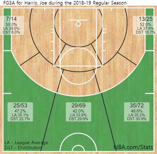#2018-2019시즌 정규리그 조 해리스 3점 슛 성공률 분포도(*27일 기준)