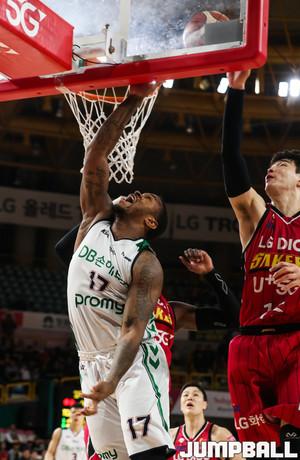 30일 창원실내체육관에서 열린 '2018-2019 SKT 5GX 프로농구' 창원 LG와 원주 DB의 경기에서 DB 김창모가 LG 메이스의 수비를 피해 리바운드를 시도하고 있다.