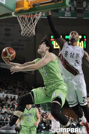 3일 원주체육관에서 열린 '2018-2019 SKT 5GX 프로농구' 원주 DB 와 안양 KGC인삼공사 의 경기에서 변준형이 레이업슛을 시도하고 있다.