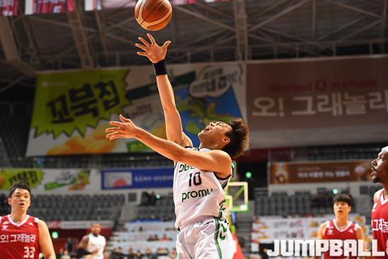 [점프볼=고양/문복주 기자] 5일 고양실내체육관에서 열린 '2018-2019 SKT 5GX 프로농구' 고양 오리온과 원주 DB의 경기, DB 김태홍이 골밑 사이드로 파고들어 슛을 시도하고 있다.
