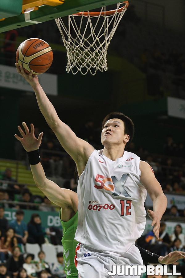 10일 원주체육관에서 열린 '2018-2019 SKT 5GX 프로농구' 원주 DB 와 서울 SK 의 경기에서 송창무가 골밑득점을 만들어내고 있다.