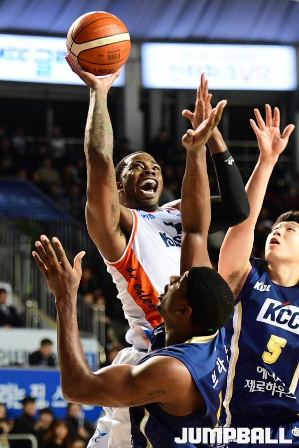 [점프볼=전주/박상혁 기자] 10일 전주실내체육관에서 2018-2019 SKT 5GX 프로농구 정규리그 전주 KCC와 인천 전자랜드의 경기가 열렸다. 전자랜드 로드가 KCC 브라운을 앞에두고 골밑에서 공격을 시도하고있다.