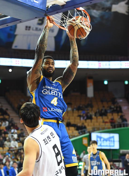 [점프볼=잠실/문복주 기자] 10일 잠실실내체육관에서 열린 2018-2019 SKT 5GX 프로농구 정규리그 서울 삼성과 안양 KGC인삼공사의 경기, 삼성 펠프스가 투핸드 덩크를 작렬하고 있다.
