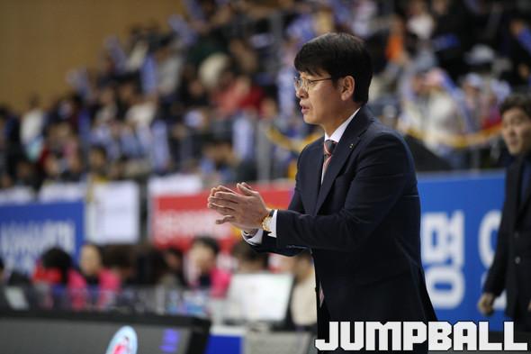 [점프볼=용인/한필상 기자] 10일 용인실내체육관에서 열린 우리은행 2018-2019 여자프로농구 정규리그 용인 삼성생명 블루밍스와 수원 OK저축은행의 경기, 수원 OK저축은행의 정상일 감독이 박수를 치며 선수들을 독려하고 있다.
