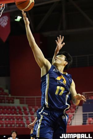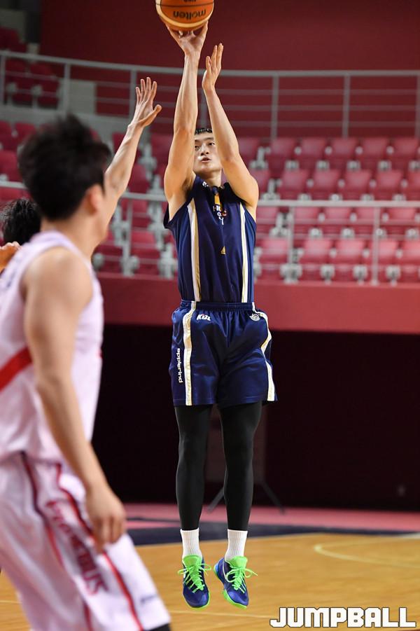 [점프볼=수원/홍기웅 기자] 11일 경희대학교 국제캠퍼스 선승관에서 열린 '2018-2019 KBL D-리그 2차 대회' KCC와 현대모비스의 경기. KCC 김국찬이 스텝을 밟아 수비를 따돌린 뒤 3점슛을 던지고 있다.