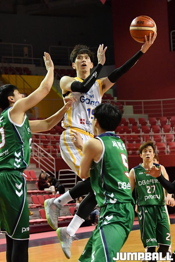 [점프볼=수원/홍기웅 기자] 11일 경희대학교 국제캠퍼스 선승관에서 열린 '2018-2019 KBL D-리그 2차 대회' DB와 삼성의 경기. 삼성 강바일이 수비를 앞에 두고 골밑슛을 올리고 있다.