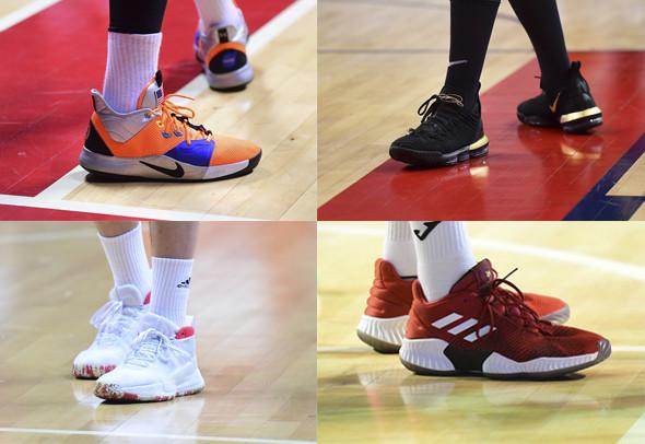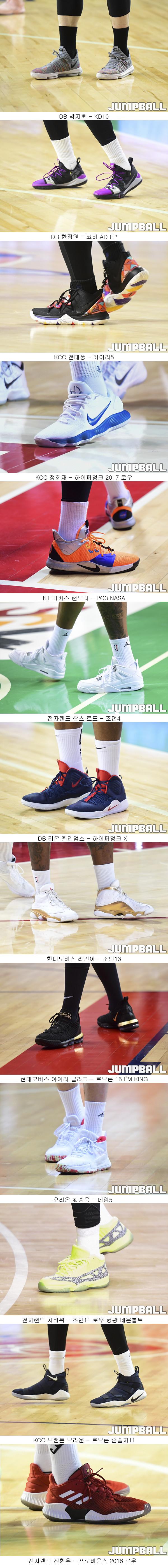 KT 마커스 랜드리는 이번에 새롭게 출시한 PG3 'NASA'를 신고 경기에 임했다. PG3 'NASA'는 한쪽 농구화 혀끝에 미국 성조기가 마킹 되어있어 미국인 출신의 외국인 선수들에게 인기가 좋다. KCC 전태풍은 최근 가드들에게 많은 사랑을 받고 있는 카이리5를 신고 코트를 누볐다. 나이키에 카이리5가 있다면 아디다스에 데임5와 프로바운스 2018 로우를 오리온 최승욱, 김진유와 전자랜드 전현우 등 움직임이 많은 선수들이 많이 착용을 하기 시작했다. 최고령의 나이로 현대모비스에 복귀한 아이라 클라크의 농구화는 르브론16으로 그의 플레이와 알맞은 농구화를 선택했다.