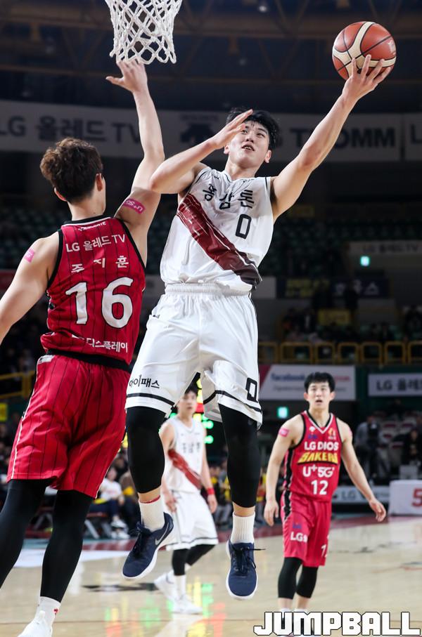 12일 창원 실내체육관에서 열린 '2018-2019 SKT 5GX 프로농구' 창원 LG와 안양 KGC의 경기에서 KGC 변준형이 LG 주지훈의 수비를 피해 슛을 하고 있다.