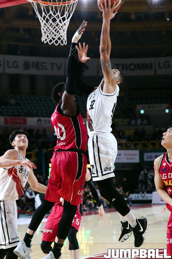 12일 창원 실내체육관에서 열린 '2018-2019 SKT 5GX 프로농구' 창원 LG와 안양 KGC의 경기에서 KGC 에드워드가 LG 메이스의 수비를 피해 슛을 하고 있다.