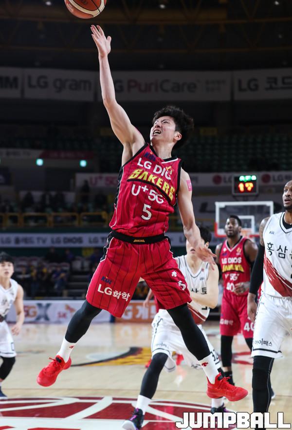 12일 창원 실내체육관에서 열린 '2018-2019 SKT 5GX 프로농구' 창원 LG와 안양 KGC의 경기에서 LG 김시래가 골밑 슛을 하고 있다.