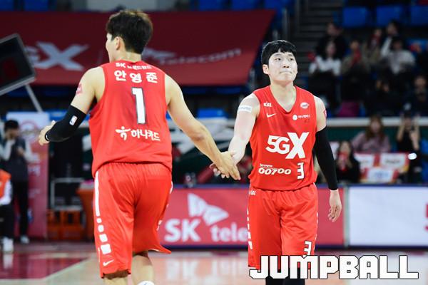 [점프볼=잠실학생/박상혁 기자] 12일 잠실학생체육관에서 2018-2019 SKT 5GX 프로농구 정규리그 서울 SK와 인천 전자랜드의 경기가 열렸다. SK 최원혁이 안영준과 하이파이브를 하고있다.