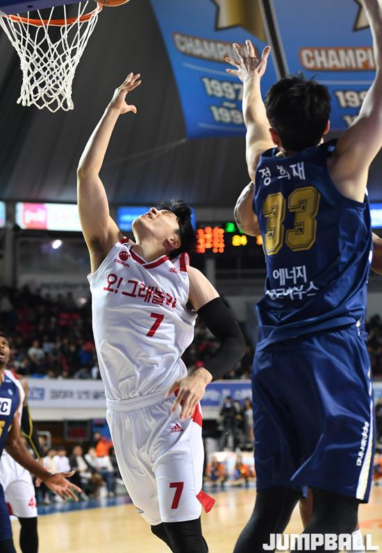 [점프볼=전주/문복주 기자] 14전주실내체육관에서 열린 '2018-2019 SKT 5GX 프로농구' 전주 KCC와 고양 오리온의 경기, 오리온 박재현이 골밑에서 두명의 수비사이를 뚫고 득점을 노리고 있다.