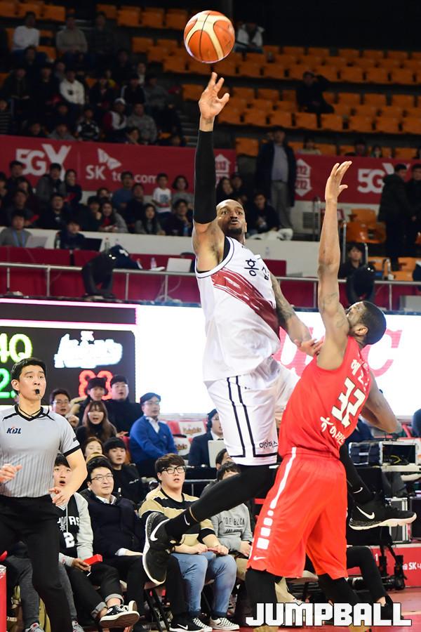 [점프볼=잠실학생/박상혁 기자] 15일 잠실학생체육관에서 2018-2019 SKT 5GX 프로농구 정규리그 서울 SK와 안양 KGC인삼공사의 경기가 열렸다. KGC인삼공사 테리가 연장을 노린 3점슛을 던지고 있다.