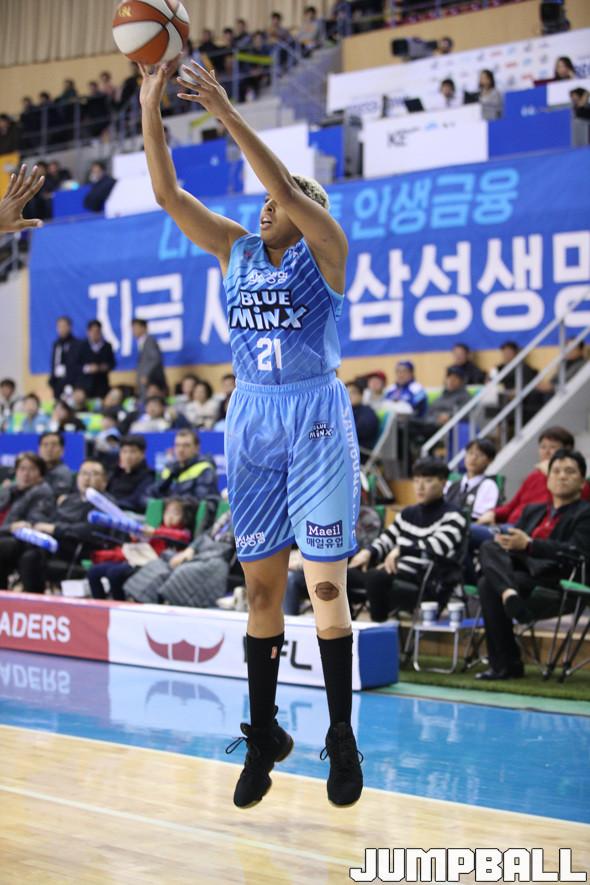 15일 용인 실내체육관에서 열린 2018-2019 여자프로농구 정규리그 용인 삼성생명과 청주 KB스타즈의 경기. 삼성생명 외국인 선수 하킨스가 수비를 피해 외곽까지 나와 3점슛을 던지고 있다.