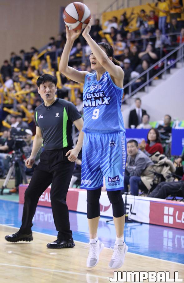 15일 용인 실내체육관에서 열린 2018-2019 여자프로농구 정규리그 용인 삼성생명과 청주 KB스타즈의 경기. 삼성생명 최희진이 승리를 확정짓는 3점포를 터트리고 있다.