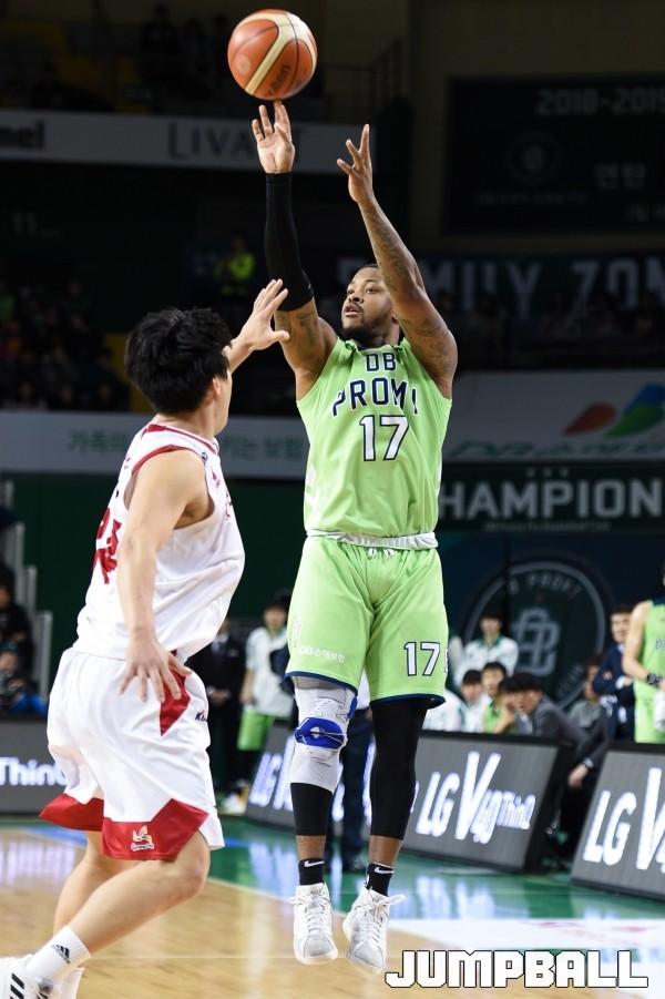 [점프볼=원주/윤희곤 기자] 17일 원주 종합체육관에서 열린 ‘2018-2019 SKT 5GX 프로농구’ 원주 DB와 고양 오리온의 경기. DB 포스터가 3점슛을 시도하고 있다.