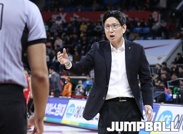 [점프볼=잠실/백승철 기자] 17일 잠실학생체육관에서 2018-2019 SKT 5GX 프로농구 서울 SK와 부산 KT의 경기가 열렸다. KT 서동철 감독이 심판에게 항의하고 있다.